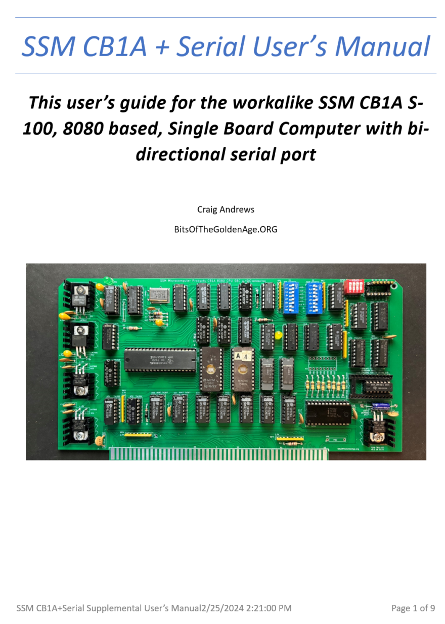 Home » SSM CB1A w/ Serial Port User’s Manual SSM CB1A w/ Serial Port User’s Manual February 25, 2024 Leave a Comment on SSM CB1A w/ Serial Port User’s Manual Share: XFacebookPinterestRedditVKDiggLinkedinMix Download Download is available until [expire_date] Version Download 45 File Size 2.87 MB File Count 1 Create Date February 25, 2024 Last Updated March 4, 2024 SSM CB1A w/ Serial Port User's Manual SSM CB1A w/ Serial Port User's Manual Related Articles 0 68 SBC-85 CPU v2 COM Mistake 0 75 Magnetic Bubble Memory Makes a Comeback (for me anyway) 0 67 Dave Dunfield’s MON85 Available for the SBC-85 0 60 STD Bus Prototyping Board
