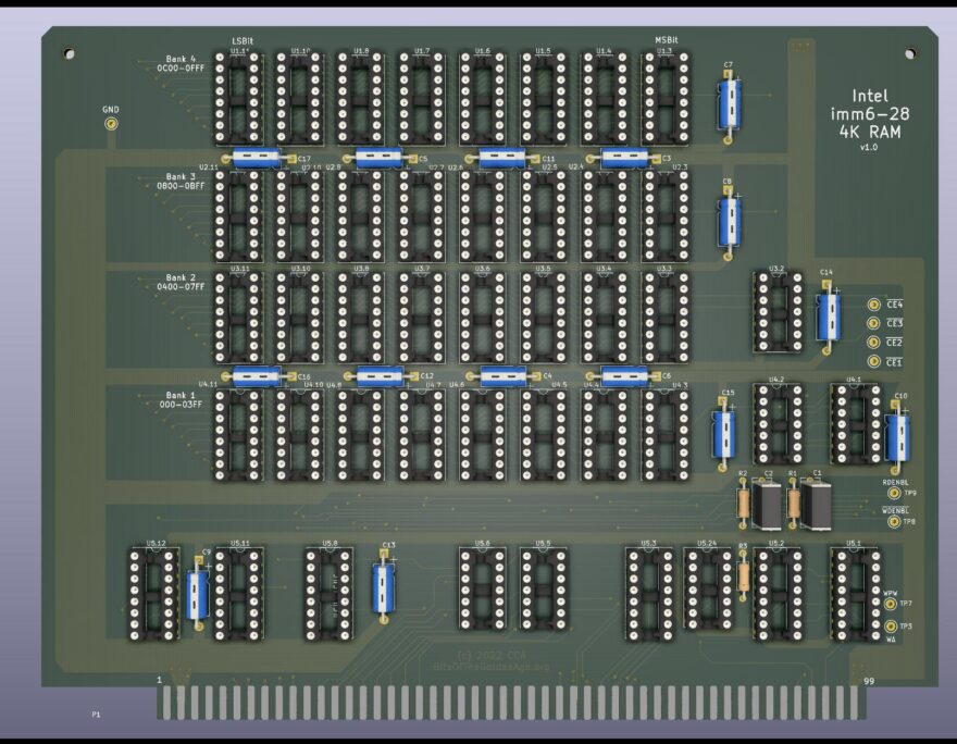 Now that the companion imm6-26 PROM board is tested, it is time to move onto testing the 5-28 RAM board. Like the PROM board, this board has 4K of memory but it is made up of four banks of 1K 2102 Static RAM chips. Also like the PROM board, this board had a few patches where I had accidently given a signal different net names so KiCAD left them separated. I have run memory software tests and the portions of memory that are opened through the PROM board are working fine. Since I have RAM and PROM, it is now time to get serious about porting my confidence test over to the intellec 8.