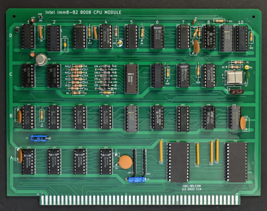 I have populated and have nearly completed my testing of the intellec 8 imm8-82 8008 CPU board, the only part left to test are the HOLD. the 8008 is a helpless little dude so there is a great amount of support logic to stretch or hold signals until the 8008 is ready to accept the signal. The intellec backplane is designed with three buses from memory, I/O, and interrupts to the CPU and one address output bus and one output data bus. This board multiplexes all the input buses from the backplane into one 8-bit bus for the 8008, and when in output mode that 8008 bus is fanned out to latches and drivers to place the data onto the backplane. Despite the limitations, if you are an 8008 fan this is a great board to build and have in your collection.